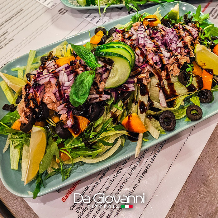 iceberg lettuce, arugula, tomato, tuna, red onion, olives, olive oil, balsamic vinegar